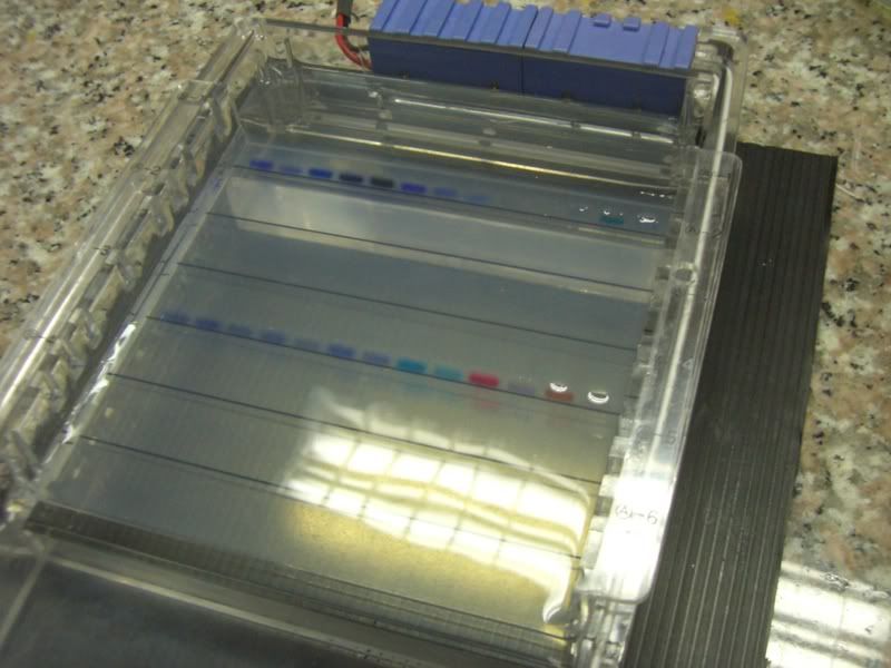 ก่อนอื่นเราก็จะหยอดตัวอย่างดีเอ็นเอที่เราทำไว้ ผสมกับสีนำทาง(เอาไว้ดู ไม่งั้นเดี๋ยวดีเอ็นเอวิ่งตกขอบ - -")