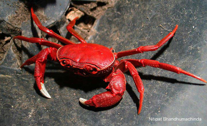 6. ปูราชินี Thaiphusa sirikit (Naiyanetr, 1992) ชื่ออังกฤษ;Regal Grab เป็นปูน้ำจืดประเภทปูป่าที่มีสีสันสวยงามที่สุด พบ;อุทยานแห่งชาติทองผาภูมิ จังหวัดกาญจนบุรี