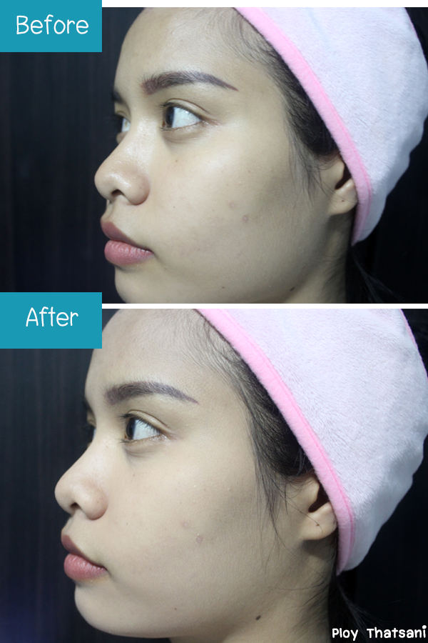 ปาดลงบนท้องแขนแล้ว มาปาดลงบนหน้ากันบ้างค่ะ ก่อนใช้นี่หน้าพลอยมันมาก ดูหมองคล้ำ รอยสิว รอยคล้ำใต้ตานี่ชัดมาก ยังไม่ได้ทารองพื้นอะไรนะคะทุกคน ทาสกินแคร์เท่านั้นเอง ลองเปรียบเทียบกับหลังใช้ดูค่ะ เห็นชัดมากว่าผิวหน้าเนียนกริบขึ้น ผิวดูแมทซ์ แต่ไม่แห้งนะคะ และดูสว่างขึ้นทันทีหลังทา ปกปิดรอยสิว รอยคล้ำใต้ตาได้ปานกลางค่ะ รู้สึกว่าไม่หนักหน้าเลยแม้แต่น้อยค่ะ