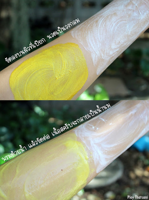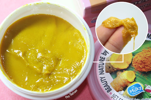 มาดูอีกสูตรกันค่ะ สำหรับสูตรนี้จะเป็นสครับเฮอร์เบิล มิลค์กี้ สครับ แอนด์ สปา สูตรเทอมาริค (ขมิ้น) ค่ะ ซึ่งทั้งกลิ่นและสีของเนื้อสครับค่อนข้างจะออกไปทางขมิ้นเด่นชัดมาก แต่ไม่เหม็นฉุนนะคะ เนื้อมีความเนียนละเอียดเช่นกันค่ะ มีสรรพคุณที่ช่วยลดเลือนจุดด่างดำ ให้ผิวเนียนนุ่ม ลดผิวแตกลาย ผดผื่นและรอยแผลเป็นเล็กๆเป็นหลักค่ะ
