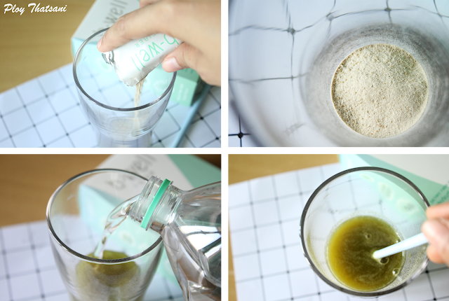 วิธีการชงง๊าย ง่าย แค่ฉีกซอง และเทลงในแก้ว เติมน้ำเย็นหรือน้ำอุณหภูมิธรรมดาก็ได้ค่ะ เพื่อละลายผง โดยเทน้ำในปริมาณ 150 มล. จากนั้นก็คนๆให้เข้ากันเลย จะบอกว่าคนไม่ต้องนานนะคะ เพราะผงของ b-well ละลายน้ำได้ไวเว่อร์ ไม่จับตัวเป็นก้อนๆ