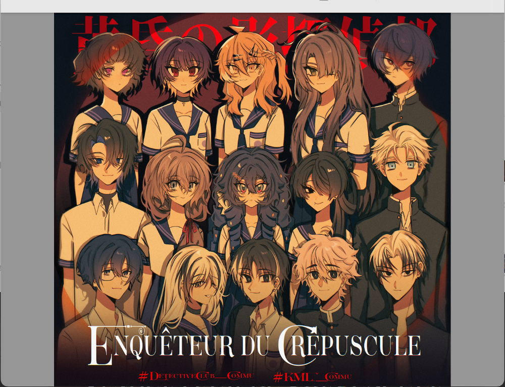 ผลงานนี้จัดทำขึ้นเนื่องในอีเว้นท์งานวัฒนธรรมของคอมมู Kumei Gakkou Community , โดย ชมรมสืบสวนแห่งแดนเงาสนธยา. ใช้ห้องชมรมทำเป็นปริศนาห้องปิดตายให้ผู้เข้าร่วมงานมาร่วมไขคดีในห้องปิดตาย CW: Murder , Knife violence and stabbing , Death , Blood , Bodies and body parts , Hallucination, Suiside , Dissociative Identity Disorder , paranoia