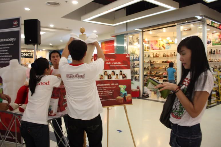 ยังจัดไม่ทันเสร็จ สงสัยวันนี้กุศลจากผลบุญของเจ้านวลจะแรงค่ะ พี่สาวคนสวยใจดีคนนึงก็ฌลยมาขอสมทบทุนซื้อเสื้อตั้งแต่เปิด Booth เลย เสื้อยังไม่มาเราก็เลยต้องถอดจากหุ่นให้คุณพี่เค้าแบบนี้ล่ะค่ะ ...