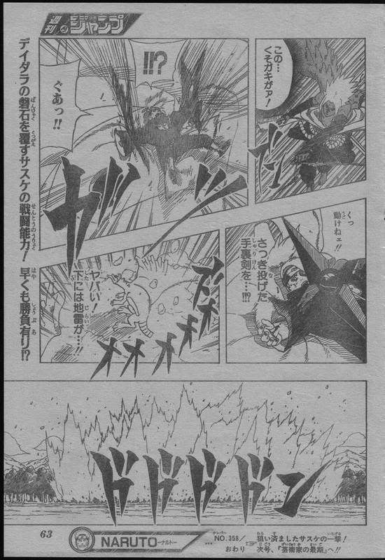 Bottom-Text : การโจมตีของซาสึเกะสำเร็จ , ตอนต่อไป : "อวสานของศิลปิน"