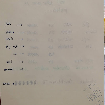 มาดูด้านหลังกันบ้าง ปากกาที่มีหมึกซึมออกมาด้านหลังอย่างเห็นได้ชัดมี monami ค่ะ แหม...ก็ด้านหน้าหมึกกองขนาดนั้น ด้านหลังไม่ซึมให้มันรู้ไป อีกด้ามที่มีหมึกซึมมาเล็กน้อยคือ Zig ขนาดหัว 1.2 ค่ะ มีปากกาอีกด้ามที่ด้านหน้าไม่มีปัญหาอะไร แต่ด้านหลังนี่ไม่ผ่านเลยคือ touch brush pen ค่ะ strokeลากขึ้นไม่มีปัญหา แต่strokeลากลงนี่ซึมเละเลยค่ะ กระดาษอันนี้ท่าทางจะไม่ค่อยชอบปากกาที่หมึกออกมาเยอะๆ แลดูจะเหมาะกับปากกาของ muji เอง แล้วก็ gel pen หัวเล็กๆ ใช้กับเมจิกหรือ brush pen คงไม่ไหว
