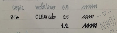 ปากกาที่ใช้ลองวันนี้มี 9 แท่งค่ะ pilot celeto 0.5, sakura micron 0.5, copic multiliner 0.5, Zig clean color 0.5 กับ 1.2, muji gel pen 0.5, monami live color ขนาด medium, pilot juice up 0.4, แล้วก็ shinhan touch liner หัว brush ค่ะ