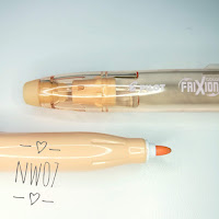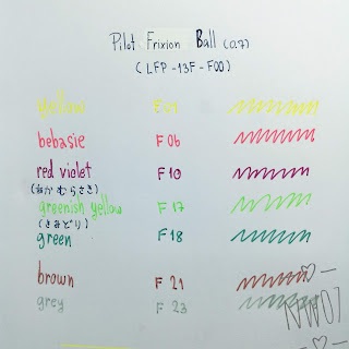 Pilot Frixion Ball เนี่ยเป็นปากกาลูกลื่นค่ะ ขนาดหัวปากกาที่วางจำหน่ายคือ 0.7 มม. จากข้อมูลของเวปไซต์ pilot.co.jp ปากการุ่นนี้มีขายทั้งหมด 24 สีค่ะ ชื่อสีอาจจะอ่านยากกันนิดนึงเพราะว่าตัวที่วางขายที่ไทยไม่มีชื่อสีเป็นภาษาอังกฤษนะคะ มีแต่ชื่อสีภาษาญี่ปุ่นค่ะ และเนื่องจากเป็นปากกาลูกลื่นเหมือนปากกาทั่วๆไป เพราะฉะนั้นเจ้า Frixion Ball ตัวนี้เนี่ย เราสามารถใช้จด short note ได้สบายเลยค่ะ ถ้าเขียนผิดทำไงดี.... ลบได้เลยค่ะคุณ ยางตรงฝาปากกาก็ใช้ลบได้สบายๆ แต่ว่าปากการุ่นนี้อ่าจจะลบได้ไม่สะอาดเท่า Frixion Colors นะคะ ไม่แน่ใจเหมือนกันว่าทำไม แต่ก็อยู่ในเกณฑ์โอเคค่ะ นว.คิดว่าลบออกได้ประมาณ 90-95% เลยทีเดียว หลังจากลบแล้วก็เขียนได้ตามสบาย