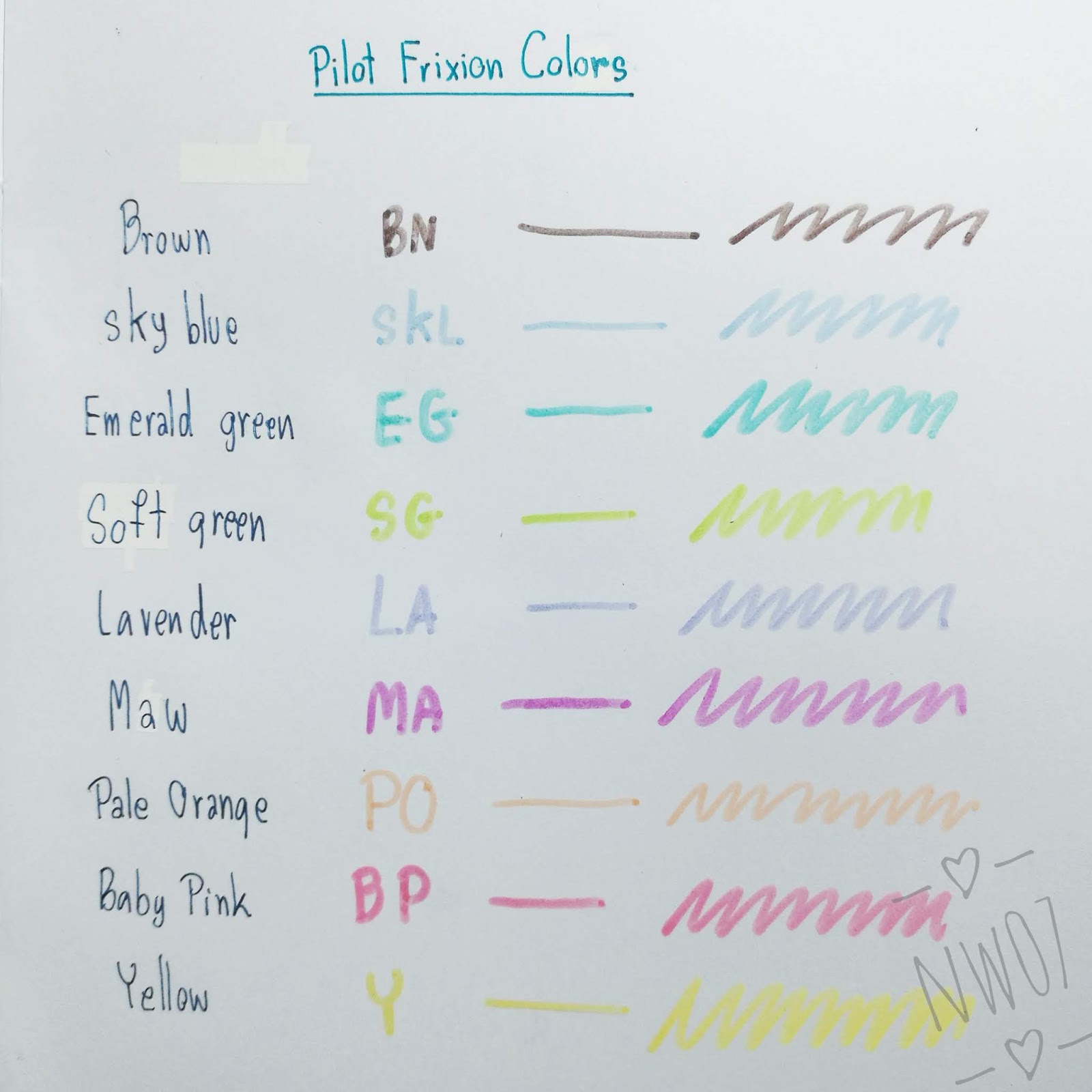 ปากกา Frixion Colors มีหลายสีเลยค่ะ ถ้าดูตามหน้าเวปของญี่ปุ่นแล้วเค้าบอกว่ามีทั้งหมด 24 สีค่ะ อืมมม ที่ไทยเนี่ยเท่าที่เจอ เหมือนจะไม่ครบนะคะ แต่ก็ไม่แน่ใจเท่าไหร่ ใครพอจะทราบช่วยคอมเมนต์บอกกันหน่อยเนอะ หรือยังไงถ้าไปเดินร้านเครื่องเขียนจะลองนับดูอีกทีค่ะ (*^ワ^*) ที่นว.มีอยู่ในอ้อมกอด 555 มีทั้งหมด 9 สีค่ะ ตามรูปข้างล่างนี้เลยค่ะ