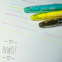 หัวปากกามีขนาด medium ค่ะ หน้าตาเหมือนปากกาเมจิกที่เราคุ้นๆกัน เวลาเขียนออกมาก็จะได้ประมาณรูปข้างล่างเลยค่ะ อย่างที่บอกไปแล้ว นว.มี 9 สีค่ะ ที่ชอบแล้วก็ใช้บ่อยที่สุดก็คือ lavender, pale orange แล้วก็ emerald green ค่ะ เอาไว้เขียนเป็นหัวข้อเวลาจดโน้ตหรือเอาไว้ใช้สำหรับไฮไลต์เพื่อเน้นสิ่งที่เราอ่านอยู่ก็ได้ค่ะ ที่ชอบจริงๆก็คือ หมึกที่เราเขียนนั้นสามารถ "ลบได้" ล่ะค่ะ แหมก็เค้าเป็น Frixion นี่เนอะ ก็ต้องลบได้อยู่แล้วตามสไตล์ปากกา series นี้ ใช่ไหมล่ะคะ มันมีที่ลบอยู่ตรงฝาปากกานะคะ บริเวณที่เป็นยางๆ หลังลบก็สะอาดดีค่ะ ไม่มีรอยหลงเหลืออยู่ แต่ว่า นว.แนะนำนิดนึงค่ะก่อนลบถ้าเพิ่งเขียนเสร็จรอแปบนึงค่ะ ประมาณซัก 5-10 วินาที ให้หมึกมันแห้งนิดนึงก่อน ถ้าใจร้อนลบเร็วเกินไปหมึกยังไม่แห้ง มันจะเป็นรอยหมึกเลอะเทอะเลยค่ะ ลบไม่ออกด้วยนะขอ บอก (>O<)