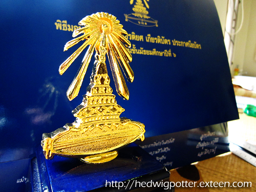 นี่คือรูปพระเกี้ยวเกียรติยศ ที่เราถอดไอ้ที่ครอบข้างบนออกแล้ว ข้างหลังคือเกียรติบัตร ซึ่งเป็นแฟ้มใส่สมุดพก