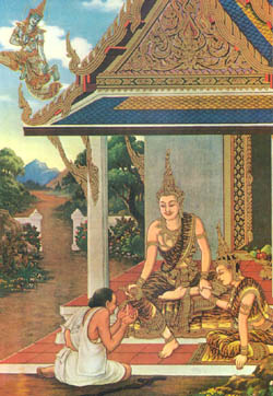 พระเวสสันดรเป็นโอรสของพระนางผุสดีกับพระเจ้าสัญชัยแห่งแคว้นสีพี เมื่อพระองค์มีพระชนมายุได้ 16 ปี ได้อภิเษกสมรสกับ พระนางมัทรีเจ้าหญิงแห่งแคว้นมัททะ มีพระโอรสและพระธิดา คือ ชาลีกุมาร และกัณหากุมารี พระเวสสันดรใจบุญมาก สร้างโรงทานไว้บริจาคคนยากจน 6 แห่ง ต่อมาได้บริจาคช้างปัจจัยนาค ซึ่งเป็นช้างมงคลให้แก่แคว้นกาลิงคะที่ส่งทูตมาขอ ชาวเมืองสีพีไม่พอใจ พากันกราบทูลพระเจ้าสัญชัยให้เนรเทศออกจากเมือง พระเจ้าสัญชัยจำต้องยอมทำตามมติของมหาชน พระเวสสันดรเองก็ยอมรับมตินั้น แต่ก่อนจากไปนั้นได้ทูลขอบริจาคทานครั้งยิ่งใหญ่เรียกว่า “สัตตสดกมหาทาน” คือให้ของอย่างละ 700 เป็นทาน มีช้าง 700 เชือก ม้า 700 ตัว วัวนม 700 ตัว รถ 700 คัน นารี 700 นาง ทาส 700 คน ทาสี 700 คน ผ้าอาภรณ์อย่างละ 700 จากนั้นได้เสด็จออกจากเมืองพร้อมกับพระนางมัทรี เจ้าหญิงกัณหา และเจ้าชายชาลี ไปจนถึงเขาวงกต ในป่าหิมพานต์แล้วได้บวช เป็นฤาษีแยกกันอยู่ โดยพระโอรสพระธิดาอยู่กับพระนางมัทรี ต่อมา พราหมณ์เฒ่าชื่อ ชูชก มาทูลขอชาลีกุมาร กับกัณหากุมารี บทนี้คุณจะต้องเลือกเพื่อเพิ่มบารมีของพระเวสสันดรมากขึ้น