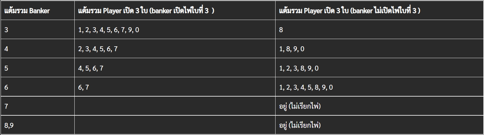 สำหรับหลักในการหยิบไพ่ใบที่ 3 ของฝั่ง banker นั้น นอกจากมองที่แต้มรวมของฝ่ายตัวเองแล้ว ยังต้องมาเทียบกับ แต้มรวมไพ่ 2 ใบแรก ของฝั่ง player ด้วยว่า มีแต้มเท่าไหร่ โดยสามารถทำเป็นตาราง อธิบายได้ ดังนี้